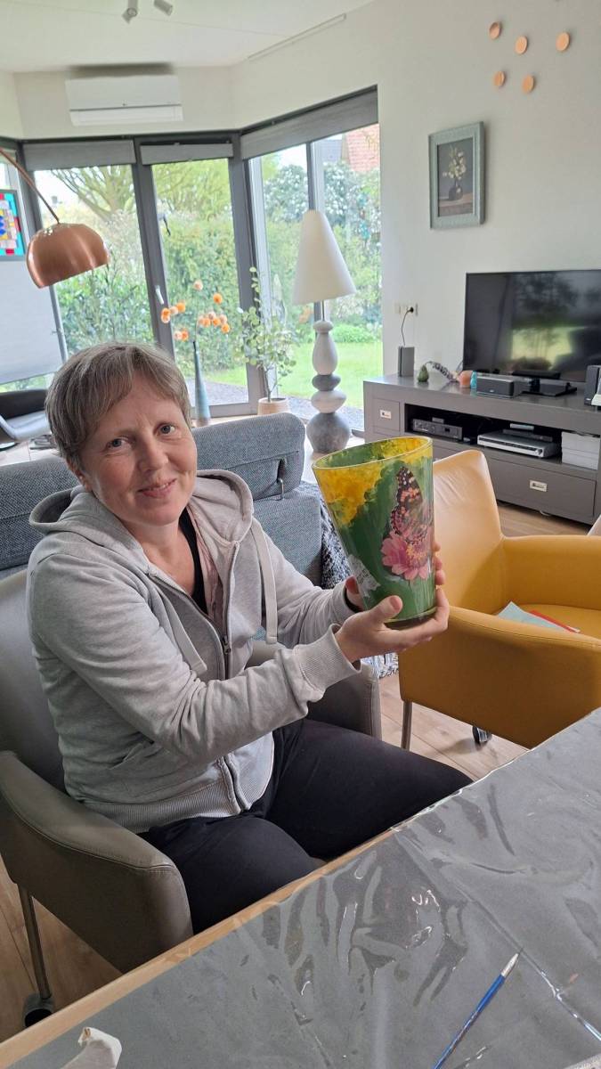 Ik leer je dan in 4-4,5 uur de technieken (decoupage) hoe je je eigen vaas of pot maakt. Helemaal naar je eigen smaak. Voor een handbeschilderde vaas heb je wel 6 uur nodig.