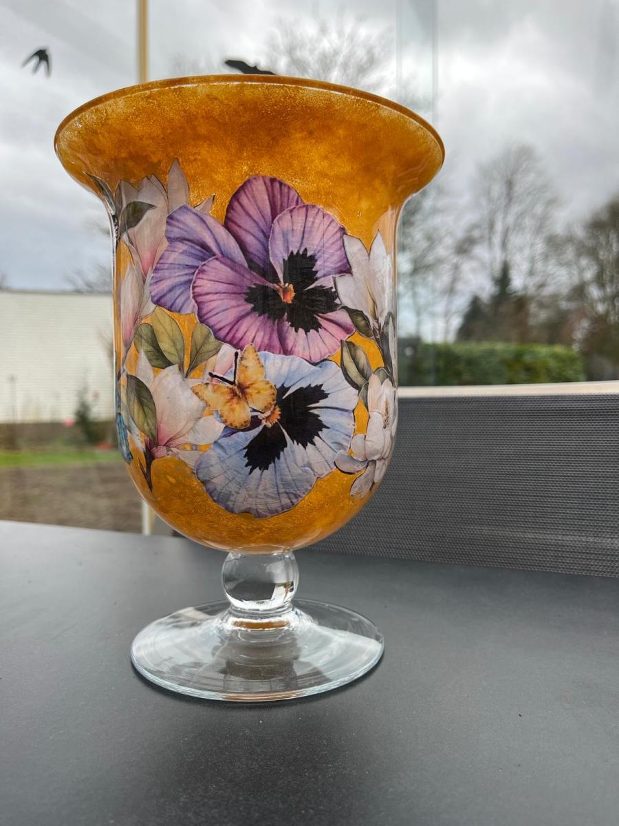 Ik leer je dan in 4-4,5 uur de technieken (decoupage) hoe je je eigen vaas of pot maakt. Helemaal naar je eigen smaak. Voor een handbeschilderde vaas heb je wel 6 uur nodig.